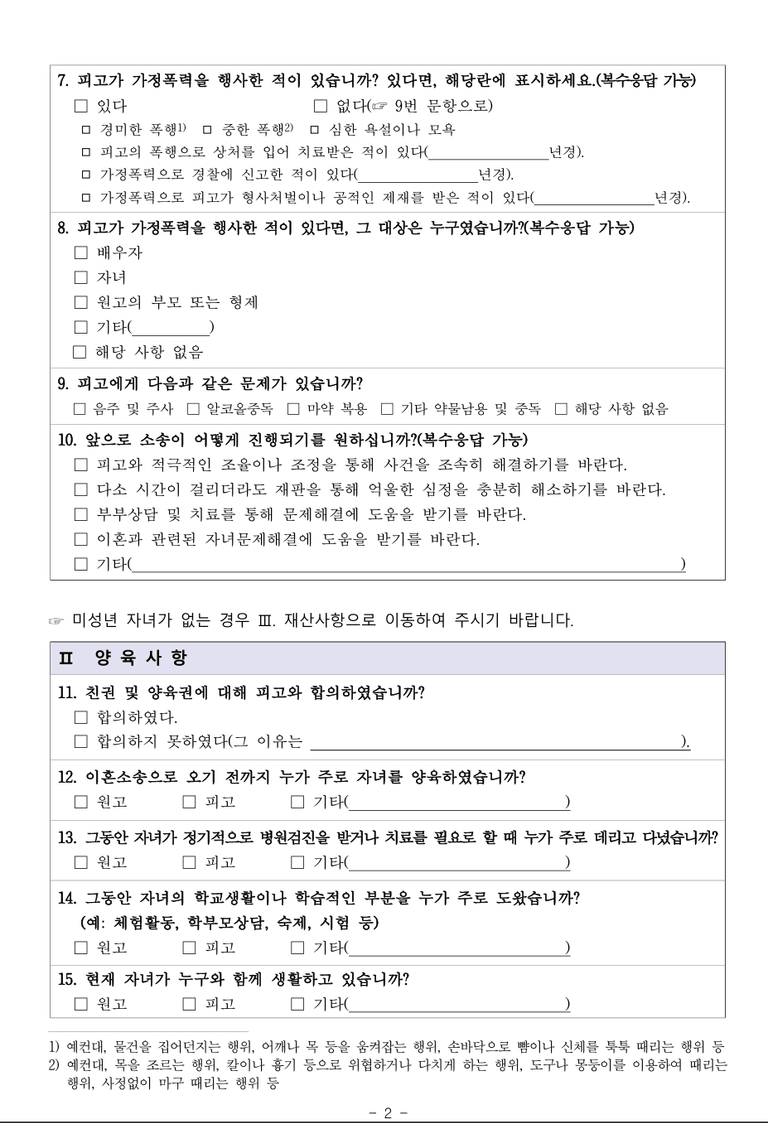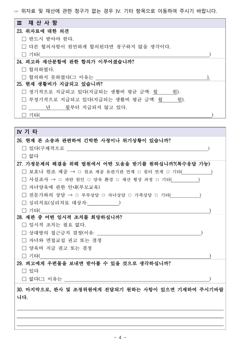 ● 기타: 법원의 상담 지원 및 임시적 조치 희망 여부