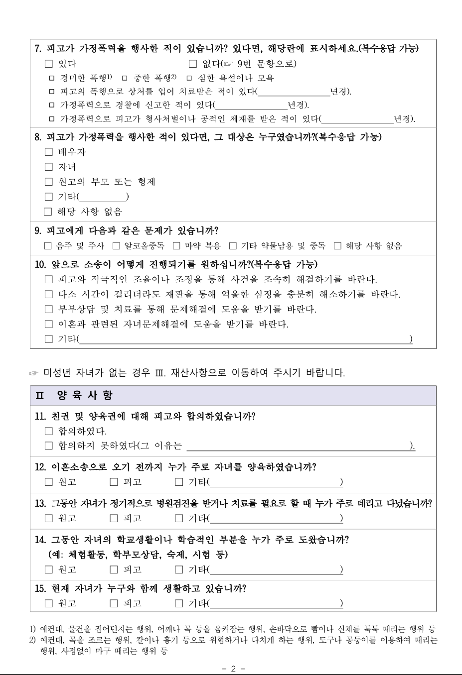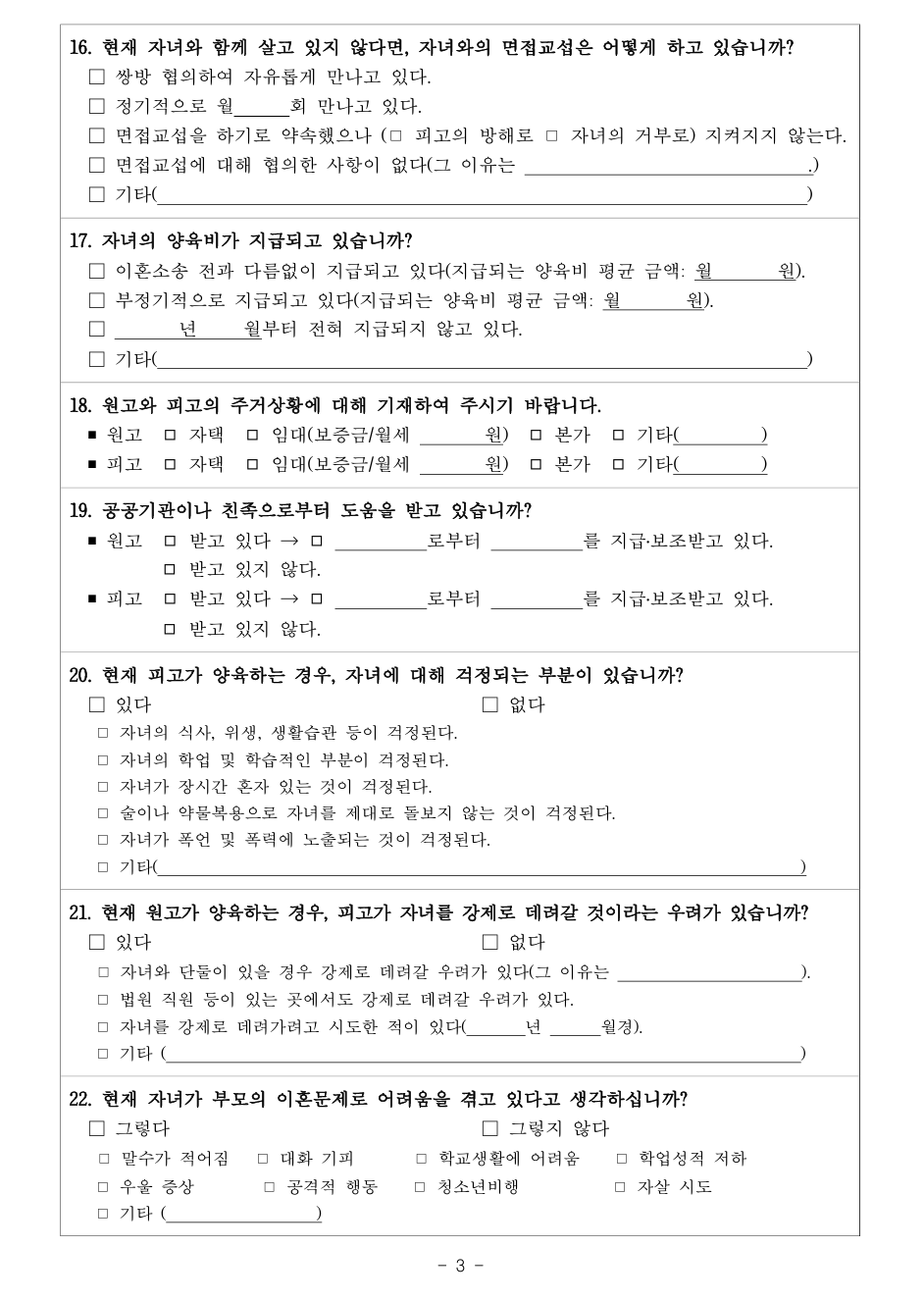 ● 양육사항: 주 양육자 확인, 면접교섭 및 양육비 지급 현황