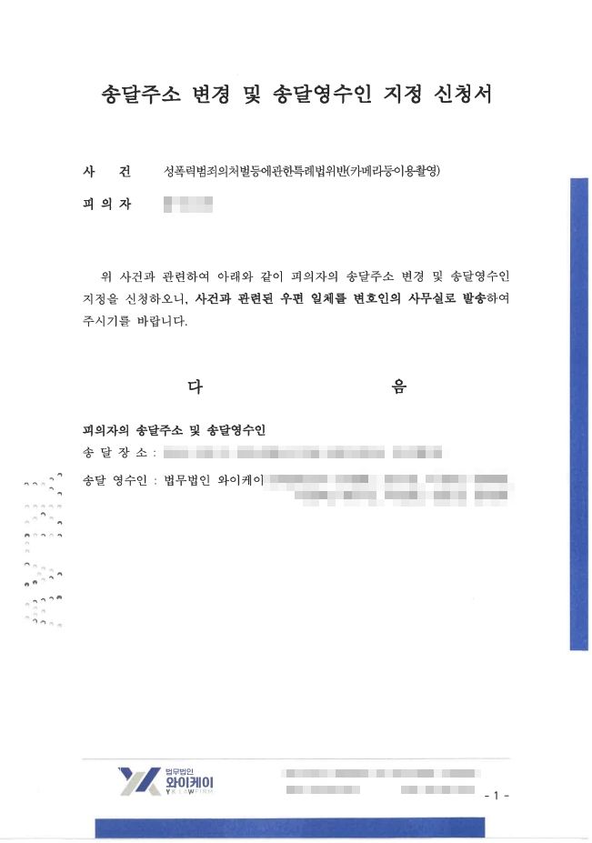 의뢰인의 보호를 위해 사건 관련 우편 일체는 법무법인 YK로 송달지를 변경하였습니다.