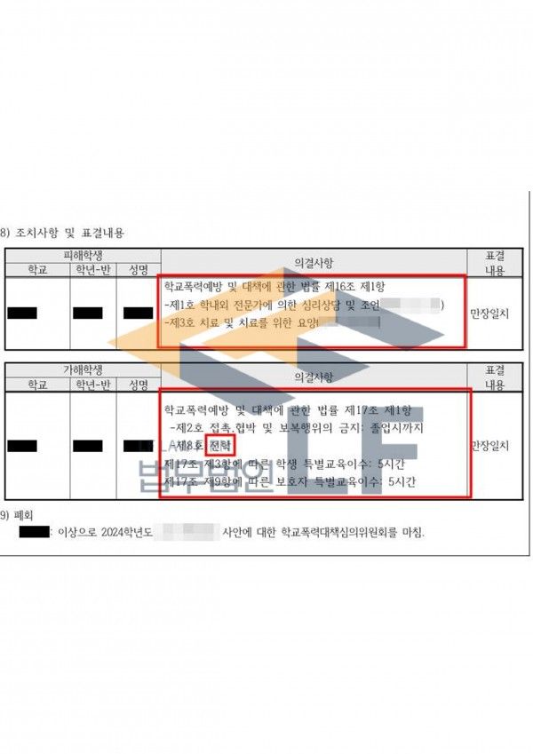 그리고 기해학생은 학교폭력심의위원회의 만장일치로 2호(피해학생 및 신고ㆍ고발 학생에 대한 접촉, 협박 및 보복행의 금지) 처분과 8호(전학)처분을 받았습니다.