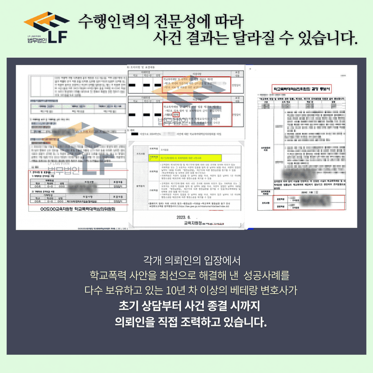 마지막으로 본 변호인은 학교폭력심의원회에 참석하여, 의뢰인의 어린 자녀가 입은 상처와 지금도 겪고 있는 가해 학생에 두려움 및 심리적 고통을 호소하며, 가해 학생과 의뢰인의 자녀가 철저히 분리되어야 함을 학교폭력심의위원회에 강력히 주장했습니다.