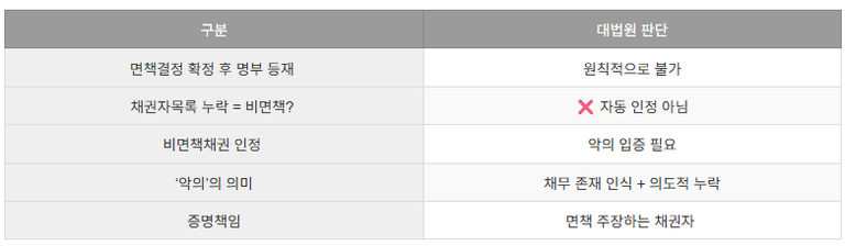 ✔ 비면책채권(악의적 채권 누락)의 판단 기준