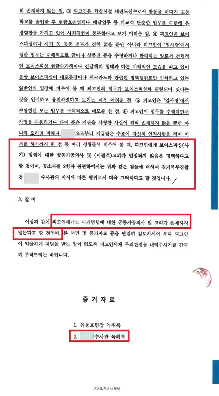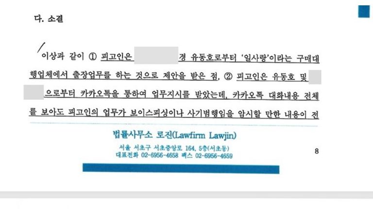 법률사무소 로진은 보이스피싱 전문 변호사로 구성되어 있습니다. 법률사무소 로진은 기존의 경험을 바탕으로 재판에서 무죄의 근거가 되는 내용을 세부적으로 추출하여 본 사안에 대입하였습니다. 특히 의뢰인이 보이스피싱 조직원으로부터 지시를 받은 수단인 카카오톡 내용을 보더라도 보이스피싱을 유추할 내용은 전혀 보이지 않은 점, 의뢰인은 당시 본인이 행한 업무를 수첩에 구체적으로 기재한 점, 의뢰인은 피해자로부터 지급받은 수표에 본인 명의를 기재하여 현금화 한 점, 의뢰인은 경기북부경찰청 수사관의 지시에 적극적으로 협조한 점 등에 비춰볼 때, 의뢰인에게 사기범행에 대한 공동가공의사 및 미필적 고의가 존재하지 않는다고 적극적으로 변론하였습니다