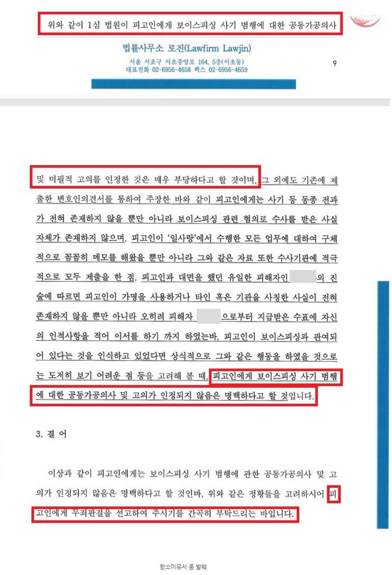 보이스피싱 전문 변호사로 구성된 법률사무소 로진은 1심에 제출했던 기존 변론요지서에 더하여 추가적인 무죄 근거를 추출하여 재차 항소이유서를 제출함으로써 의뢰인의 무죄를 적극적으로 주장하였습니다. 특히 의뢰인은 증거인멸 행위를 전혀 하지 않았고, 오히려 적극적으로 카카오톡 대화 내용 뿐만 아니라 의뢰인의 업무를 꼼꼼히 메모하여 수사기관에 제출한 점, 의뢰인이 대면했던 피해자의 진술에 따르더라도, 의뢰인은 가명을 사용하거나 혹은 기관을 사칭한 사실이 전혀 존재하지 않은 점, 의뢰인은 보이스피싱 조직원이 설명해준 업체를 검색하여 동일한 업체를 확인한 점 등을 추가로 주장하였습니다.