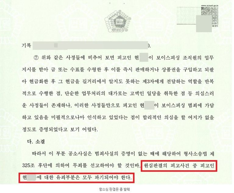 이번 포스팅 내용은 저희 로펌에서 담당했던 사건 중 아르바이트 명목으로 피해자로부터 수표를 직접 받아 전달해주거나, 금을 직접 받아 이를 현금화 한 후 전달해주는 방식으로 보이스피싱 사건에 연루가 되어 1심에서 일부 무죄를 받았지만, 재차 항소를 하여 전부 무죄를 받아낸 성공사례입니다. 특히 이 사건에서는 의뢰인에 대한 추가 사건(피해금이 더 많은 사건)이 검찰에서 조사 중이었는데, 재판에서 무죄를 얻어냄으로써 추가 사건도 무혐의로 종결될 수 있었던 사건이었습니다.