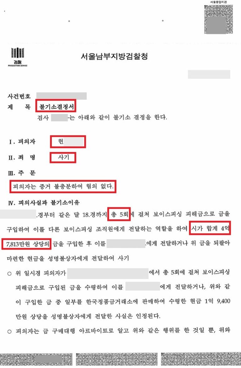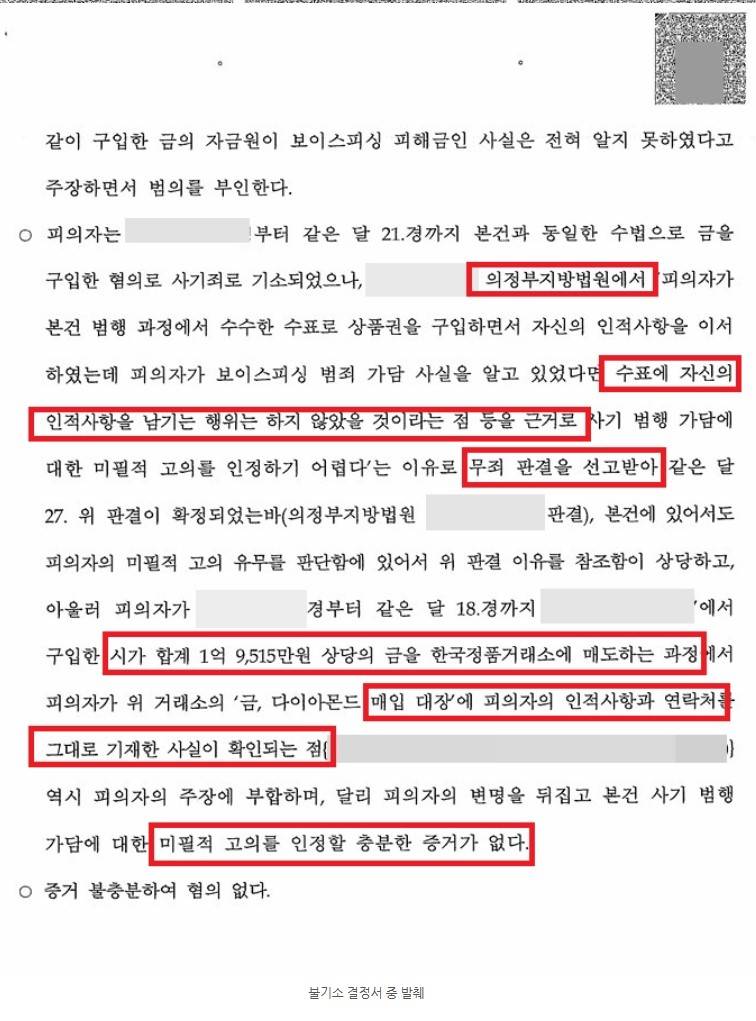 의뢰인이 법률사무소 로진을 찾아오셨을 때, 의뢰인에게는 이미 재판에 기소된 사건과 검찰 단계에 송치된 사건이 있었습니다. 두 사건은 모두 동일한 기회에 발생하였고, 피해자만 다른 사건이었습니다. 하지만 검찰 단계에 송치된 사건의 피해금은 총 4억 7000만원 가량으로 재판에 기소된 사건보다 피해금이 더 많았습니다. 따라서 반드시 재판에 기소된 사건에서 반드시 무죄 판결을 받아내야 검찰 단계의 사건도 쉽게 해결할 수 있었습니다. 물론 보이스피싱 사건을 전문적으로 수행하는 법률사무소 로진은 재판에 기소된 사건에서 무죄 판결을 얻어냈습니다. 그리고 검찰은 법원의 판단을 따를 수 밖에 없습니다. 검찰 역시 판결의 근거를 원용하면서 의뢰인의 추가건에 대해서도 증거불충분 무혐의 처분을 하였습니다. 완벽한 결말이었습니다.
