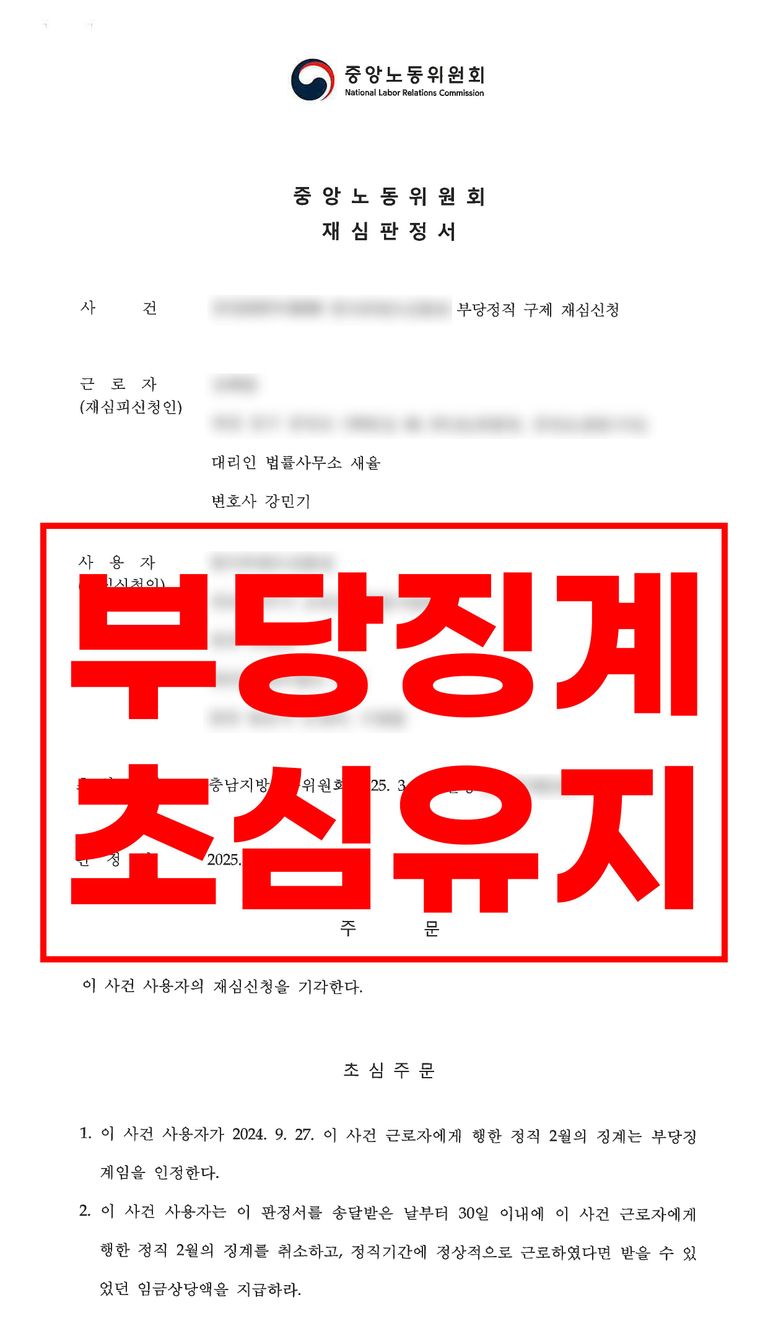 중앙노동위원회는 회사의 재심 신청을 기각하고, 지방노동위원회에서 인정했던 부당징계 판정을 그대로 유지했습니다.