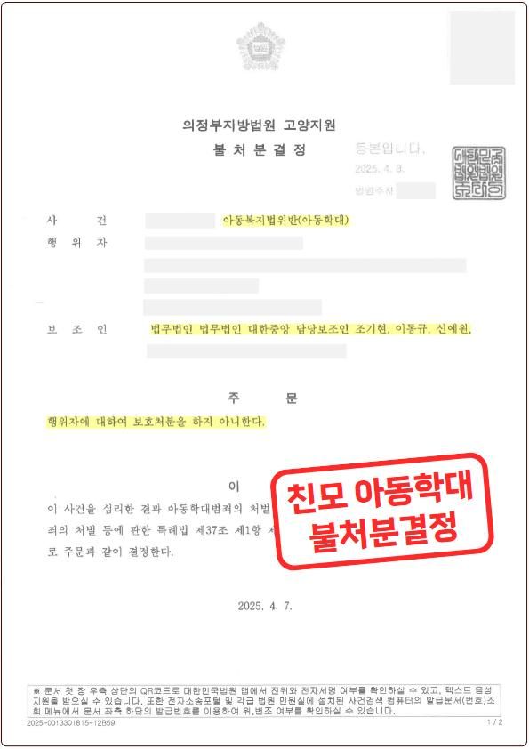 ![[⚡아동학대]문밖에서 울던 아이, 친모 학대 혐의 불처분결정](/_next/image?url=https%3A%2F%2Fd2ai3ajp99ywjy.cloudfront.net%2Fuploads%2Ftitleimage%2Foriginal%2F5bebe6abaa5b6b7cfa3ceeea-original.jpg&w=3840&q=75)
