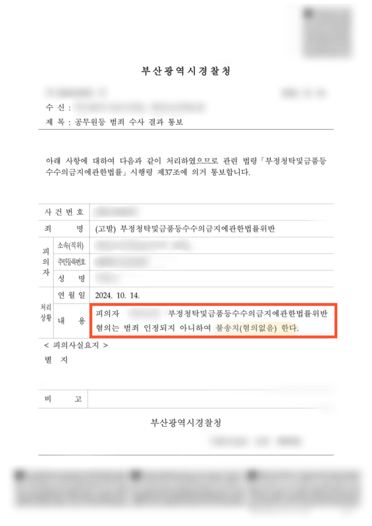 이러한 진앤솔 법률사무소 강정한 변호사의 조력으로 경찰 조사 단계에서 "불송치(혐의없음)" 처분이 내려졌습니다.