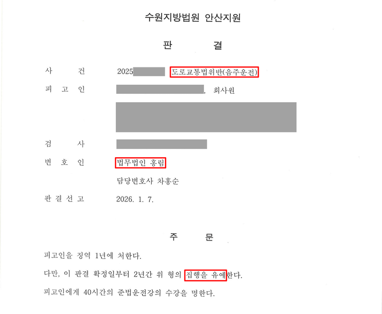 이는 음주운전 재범 사건임에도 불구하고, 실형 선고를 피하고 집행유예로 방어한 결과로, 법무법인 홍림의 체계적인 양형자료 준비와 전략적 변론이 실질적인 결과로 이어진 사례입니다.