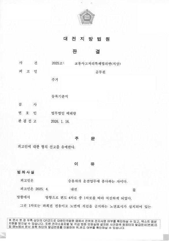 피고인(의뢰인)은 2025년 4월, 대전 ㅇㅇ구에서 승용차를 운전하던 중 직진 금지 노면 표시가 된 1차로(좌회전 전용)에서 직진한 과실이 있습니다. 이 과정에서 2차로를 따라 정상적으로 직진하던 택시와 충돌하여, 택시 운전사에게 약 2주간의 치료가 필요한 요추 염좌 등의 상해를 입힌 혐의로 기소되었습니다.