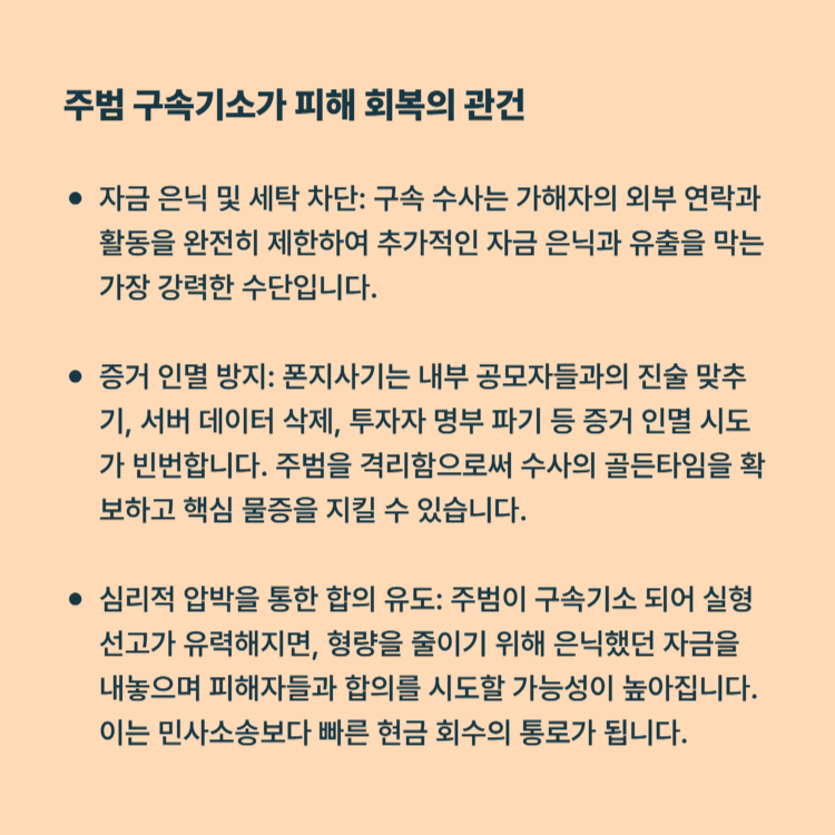 자금 은닉 및 세탁 차단: 주범이 자유로운 상태라면 차명 계좌를 이용해 범죄 수익을 세탁하거나 가상화폐 등으로 은닉할 시간을 벌게 됩니다. 구속 수사는 가해자의 외부 연락과 활동을 완전히 제한하여 추가적인 자금 유출을 막는 가장 강력한 수단입니다.
