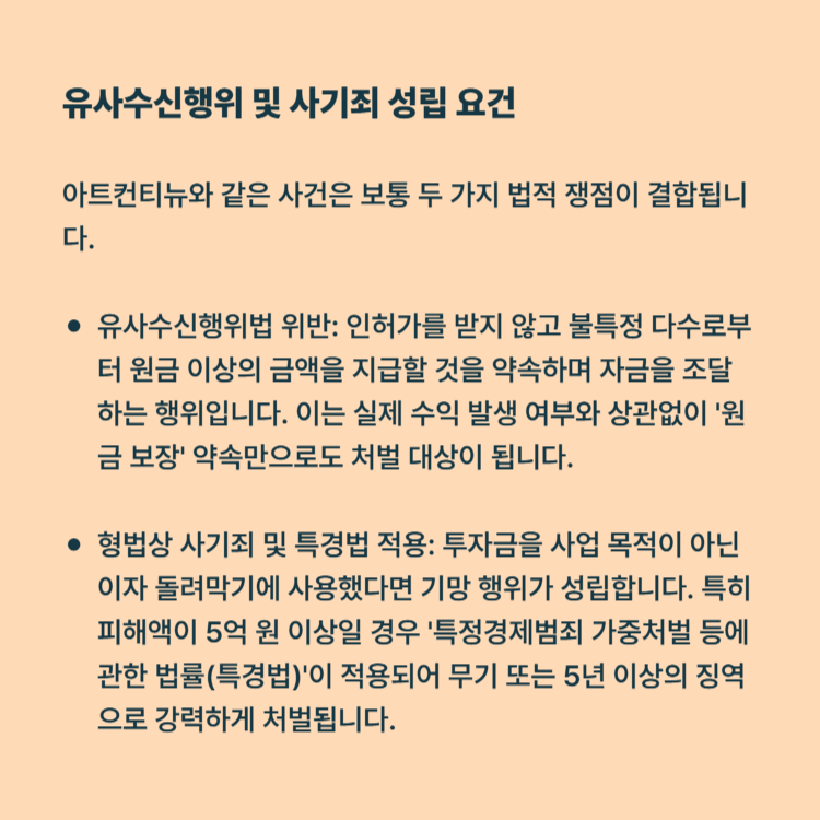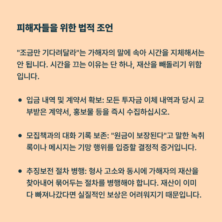 폰지사기는 피해자들의 간절함을 이용한 악질적인 경제 범죄입니다. 아트컨티뉴 사태처럼 피해 규모가 크고 이해관계자가 복잡한 사건일수록 초기 대응 속도가 전체 피해 회복의 90%를 결정합니다.
