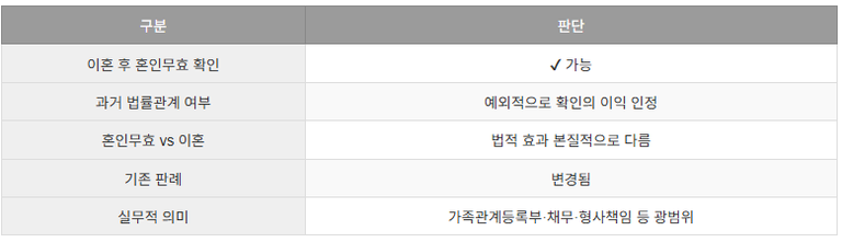 👉 “이미 이혼으로 혼인관계가 해소되었으므로 혼인무효 확인은 과거의 법률관계에 대한 확인에 불과하다”
