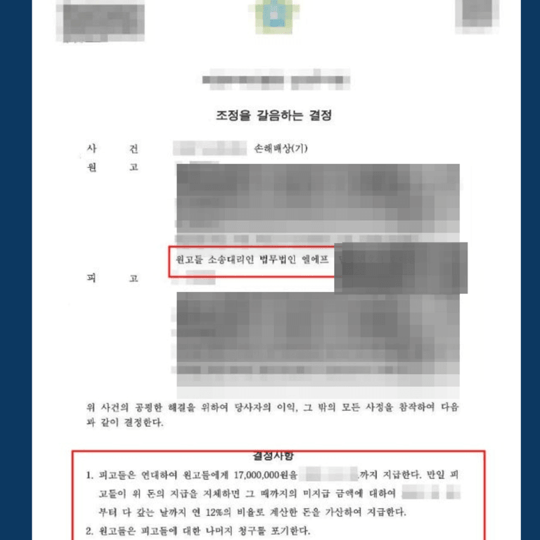 법원에서는 피고인들/가해자들의 불법행위를 인정해 1천 700만원을 의뢰인의 자녀에 지급하라는 조정을 갈음하는 결정을 내렸습니다.