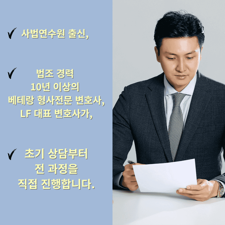 **본 변호인은 사건의 결과가 제 가치를 증명한다는 생각으로 매 사건에 전력을 다해 임하고 있습니다. 의뢰인과 수시로 소통하며 초기상담부터 재판이 종료될 때까지 전 과정을 직접 조력합니다.