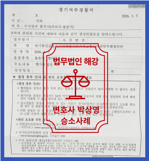 저희 법무법인 해강은 법리적인 검토를 통하여 의뢰인 상황에 맞춘 변호인 의견서 등 작성을 통하여 의뢰인을 위해 최선을 다하였고 이에 [불송치]을 이끌어냈습니다.