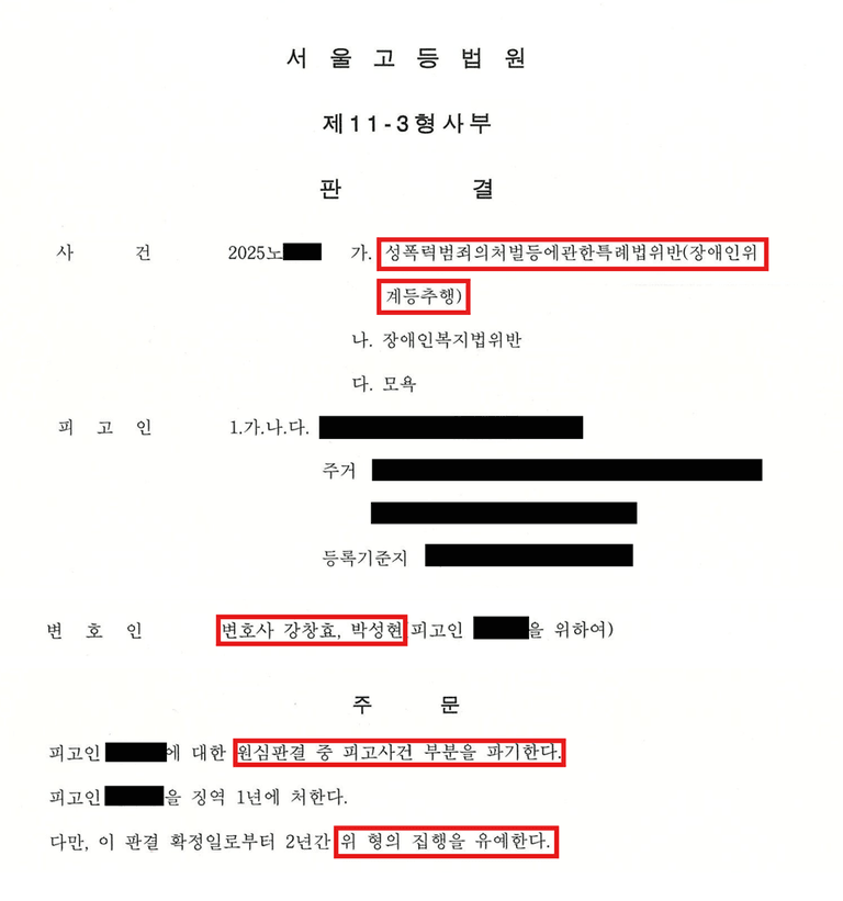 오늘은 성폭력처벌법 위반(장애인에 대한 위계·위력 추행) 혐의로 기소되었고, 1심에서 실형을 선고받고 법정 구속되었으나, 항소심에서 집행유예를 받아낸 사례를 소개하겠습니다.