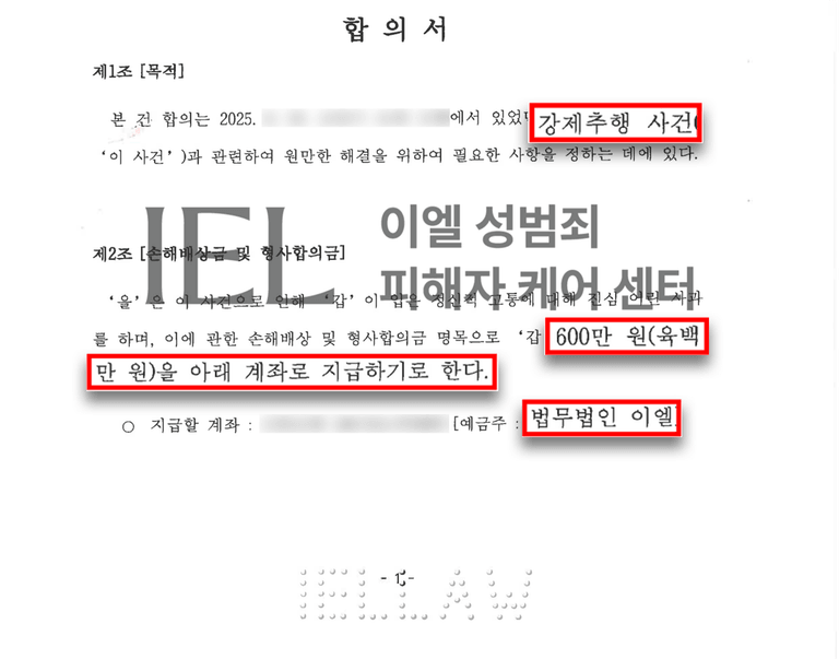· 합의의 실효성 강화 : 합의금 600만 원 지급뿐 아니라 접근 금지, 연락 금지, 사건 내용 비밀유지, 의무 위반 시 합의 무효 및 위약벌 조항을 함께 구성해 합의 이후 리스크를 구조적으로 차단
