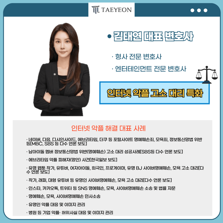 바로 수많은 유명인 분들께서 악플 피해를 겪으실 때마다 태연법률사무소를 찾으시는 이유입니다.