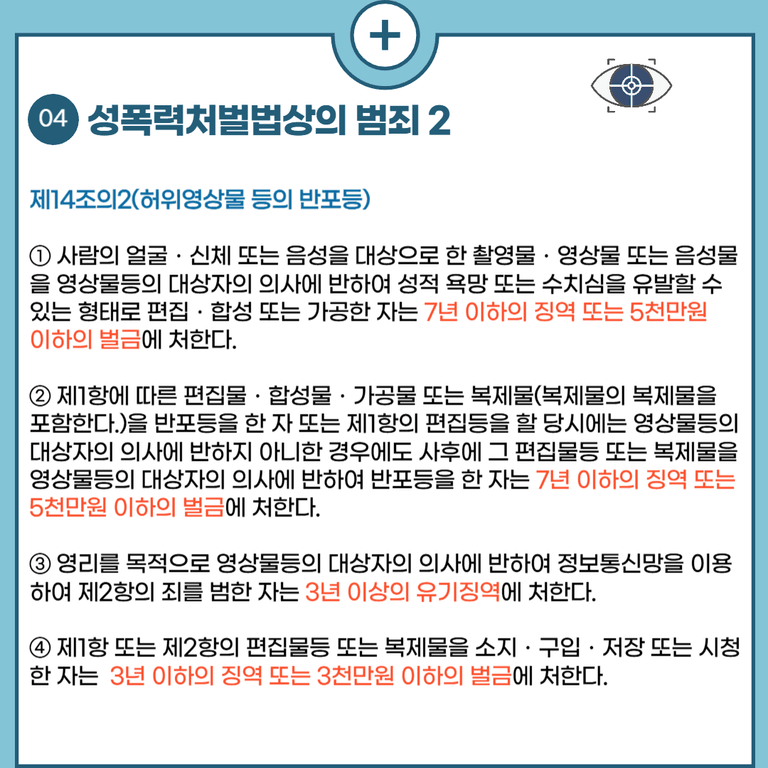 뿐만 아니라 흔히들 '딥페이크' 영상이라고 불리는 편집·조작 영상의 경우에는 편집, 합성, 가공의 행위 뿐만 아니라 소지, 구입, 저장, 시청만 하여도 처벌할 수 있게끔 규정하고 있습니다.