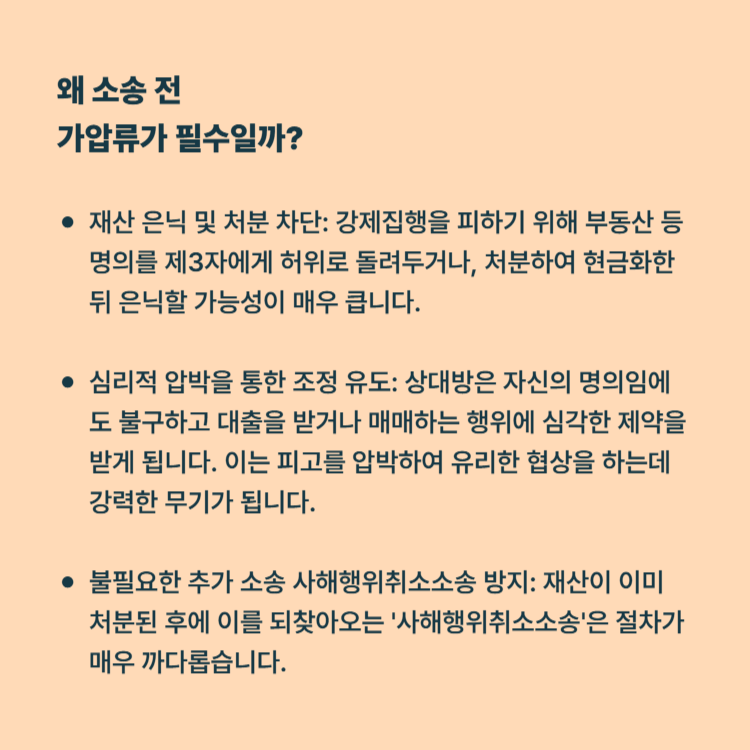 불필요한 추가 소송 방지: 재산이 이미 처분된 후에 이를 되찾아오는 '사해행위취소소송'은 입증 책임이 청구인에게 있고 절차가 매우 까다롭습니다. 애초에 가압류로 재산을 묶어두는 것이 시간과 비용을 아끼는 가장 현명한 방법입니다.