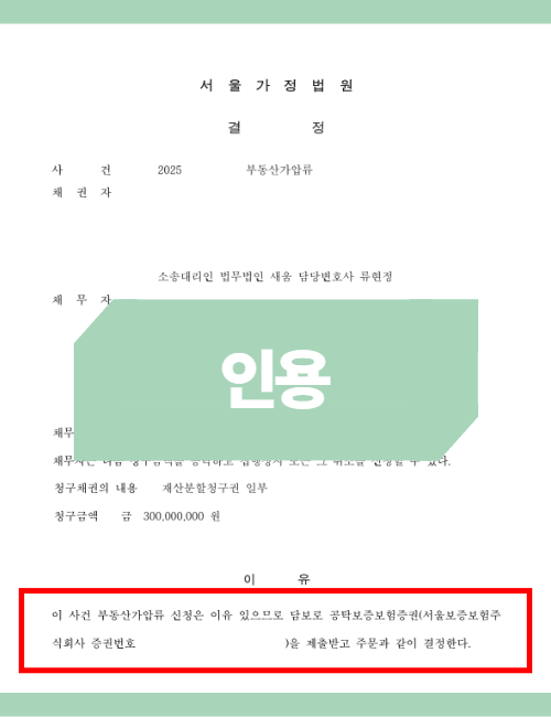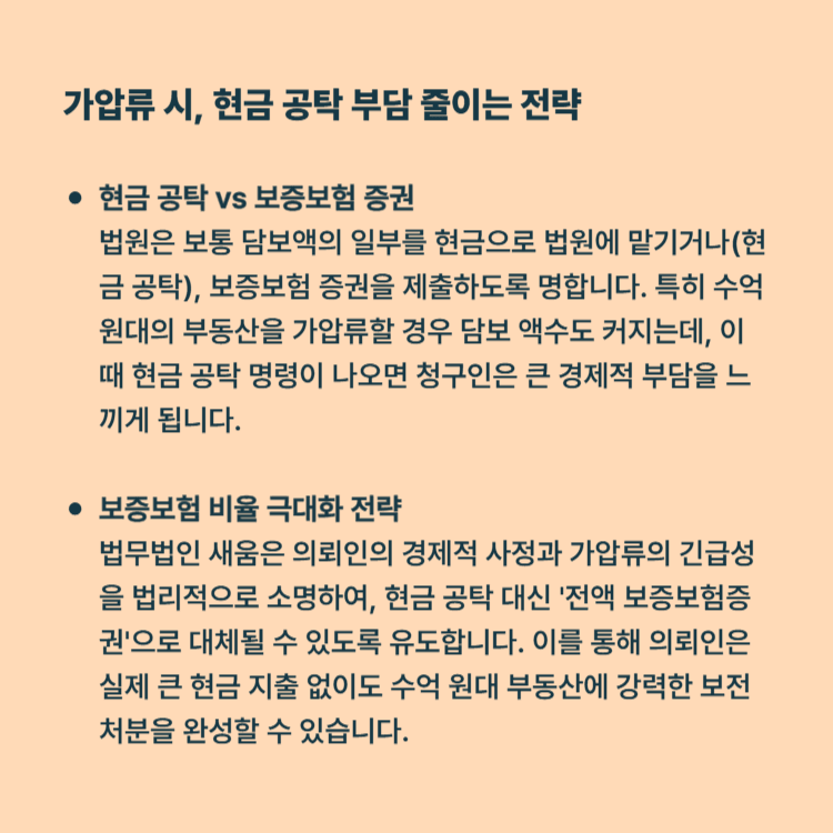 현금 공탁 vs 보증보험 증권: 법원은 보통 담보액의 일부를 현금으로 법원에 맡기거나(현금 공탁), 보증보험 증권을 제출하도록 명합니다. 특히 수억 원대의 부동산을 가압류할 경우 담보 액수도 커지는데, 이때 현금 공탁 명령이 나오면 청구인은 큰 경제적 부담을 느끼게 됩니다.