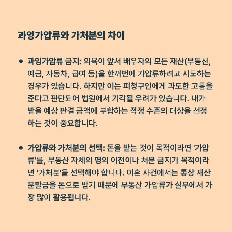 과잉가압류 금지: 의욕이 앞서 배우자의 모든 재산(부동산, 예금, 자동차, 급여 등)을 한꺼번에 가압류하려고 시도하는 경우가 있습니다. 하지만 이는 피청구인에게 과도한 고통을 준다고 판단되어 법원에서 기각될 우려가 있습니다. 내가 받을 예상 판결 금액에 부합하는 적정 수준의 대상을 선정하는 것이 중요합니다.