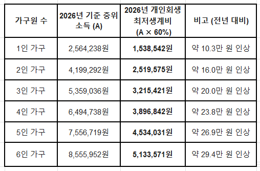2. 2026년 기준 중위소득 및 개인회생 최저생계비 (확정)