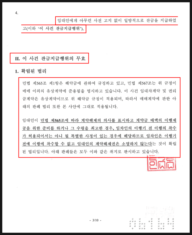 또한 계약 해제 의사가 선행된 경우, 상대방이 뒤늦게 잔금을 송금하더라도 이를 이유로 해제권을 박탈할 수 없다는 대법원 판결의 취지를 근거로 제시하며, 신규 임차인의 주장에는 법적 정당성이 없음을 분명히 했습니다.