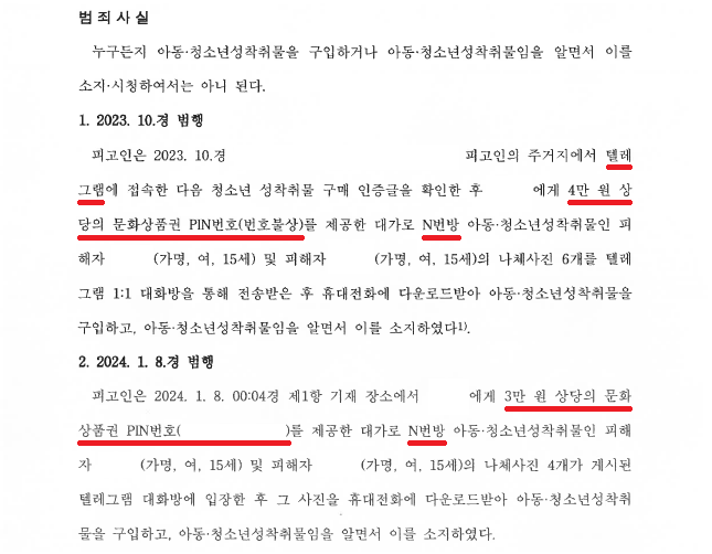A씨는 2023. 10.경 텔레그램 음란물 유료방에 입장하여 4만 원 상당의 문화상품권 PIN 번호를 전송하고 N번방 성착취물 6개를 다운받았습니다.