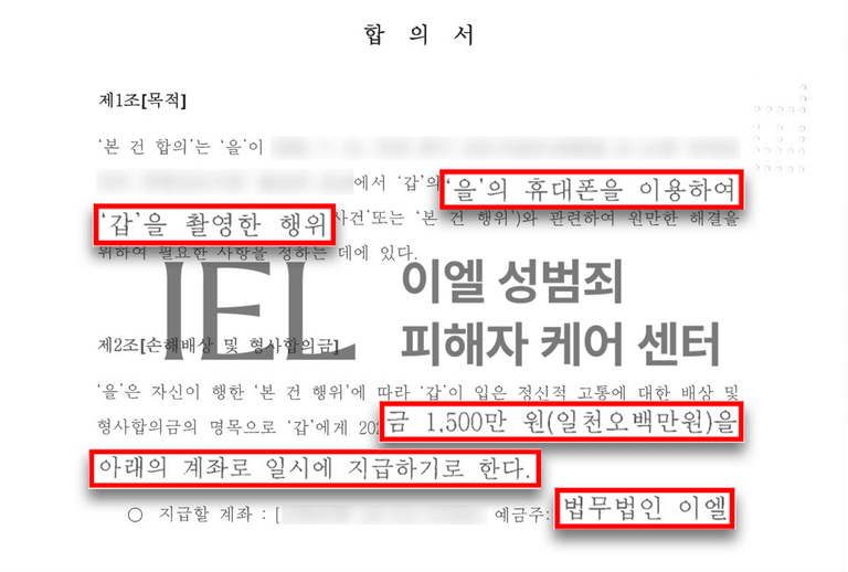 특히 촬영물 관련 조항이 단순한 선언에 그치지 않도록, 촬영물 완전 삭제와 보관·저장 금지, 추후 발견 시 합의 무효, 보관 위반 시 위약벌 1억 원, 유포 시 추가 위약벌 5천만 원 등 강한 제재 구조가 함께 포함되어 피해자의 불안을 실질적으로 낮추는 방향으로 설계되었습니다.