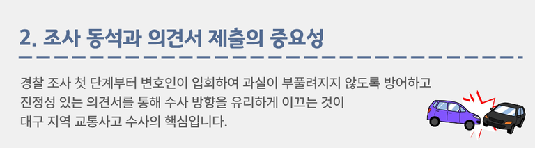 이때 대구교통사고변호사의 조력을 받는다면 조사 초기부터 합리적인 해결 방향을 설정할 수 있습니다.