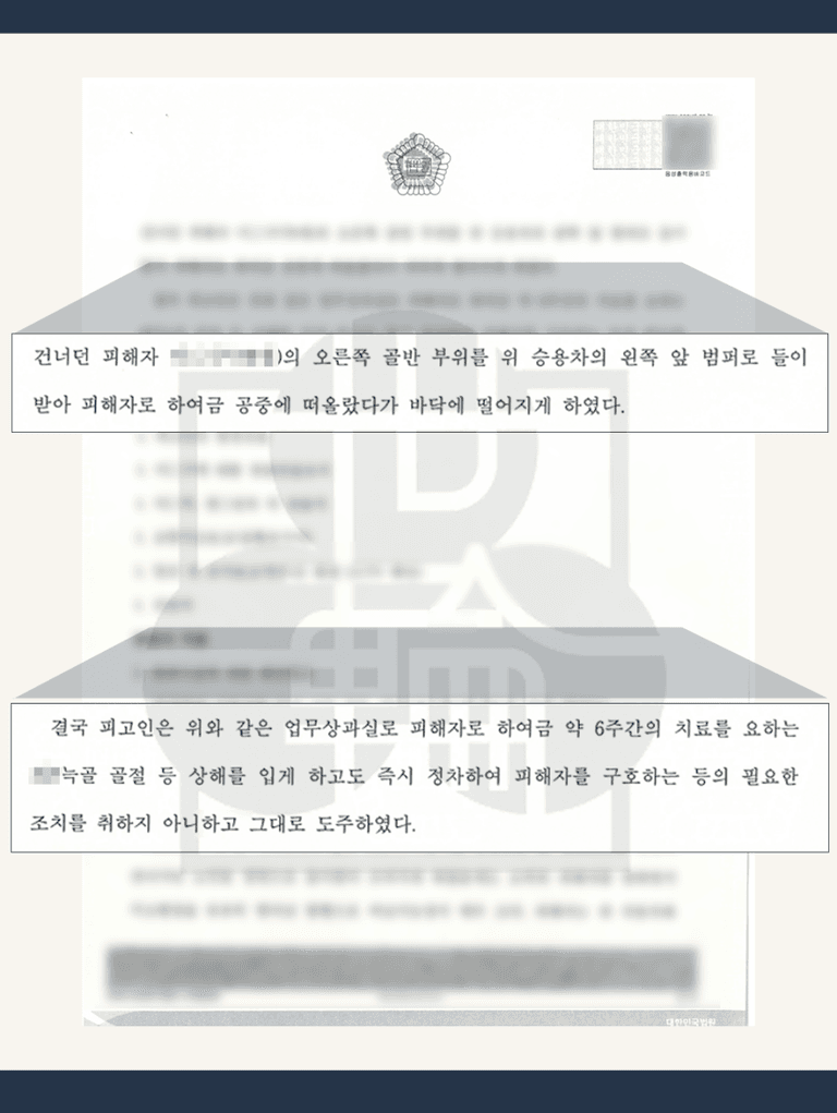 그러나 다음 날, 피해자가 통증을 호소하며 병원에 입원했고, 사고 현장 인근의 CCTV 분석을 통해 의뢰인이 가해자로 특정되었습니다. 이후 A씨는 경찰 조사를 거쳐 사건은 검찰로 송치되었고, 구속영장이 청구되어 의뢰인은 결국 구속 상태에서 재판을 받게 되었습니다.