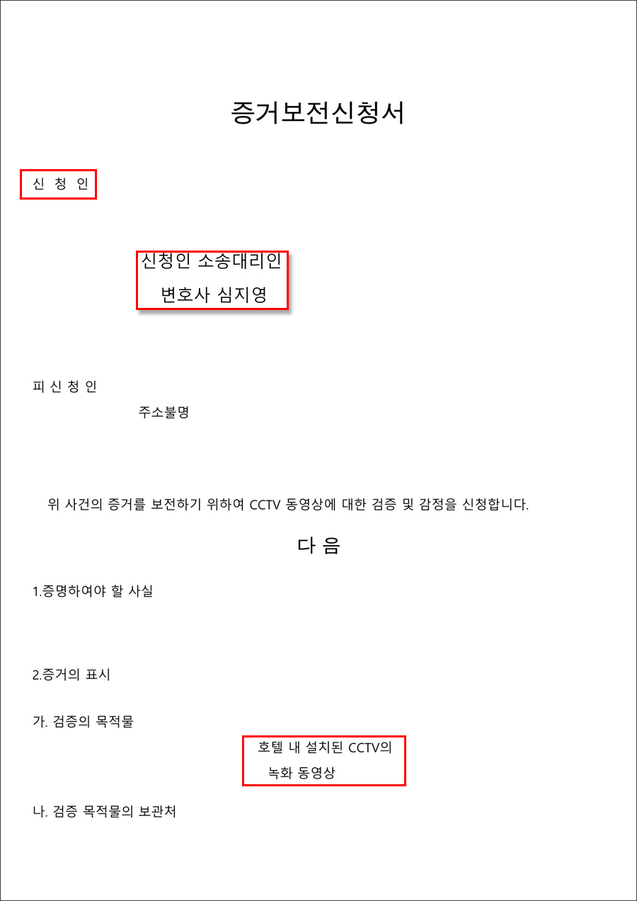 아래 이미지는 본 사건에서 실제로 법원에 제출한 증거보전신청서 양식입니다.