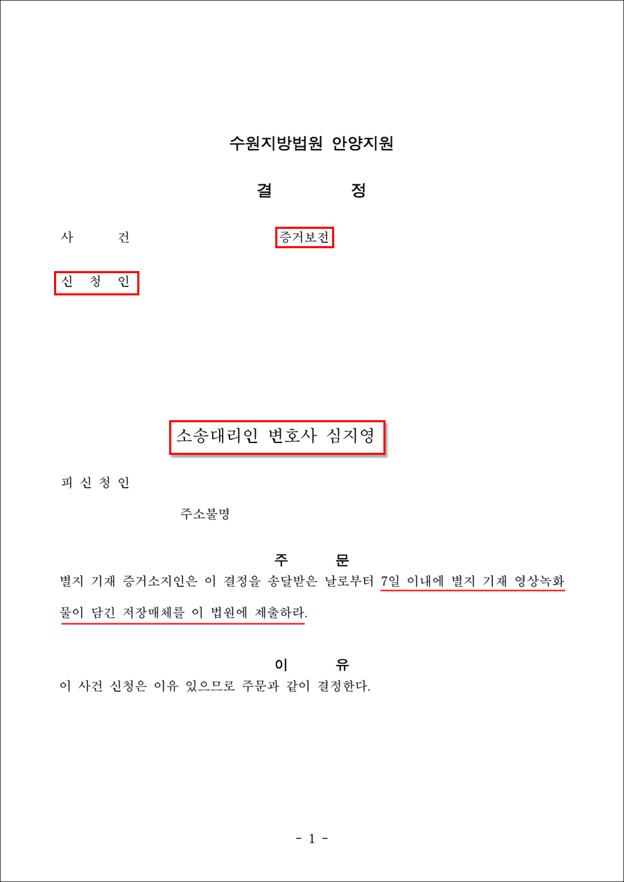 별지 기재 증거소지인은 이 결정을 송달받은 날로부터 7일 이내에 별지 기재 영상녹화물이 담긴 저장매체를 이 법원에 제출하라.