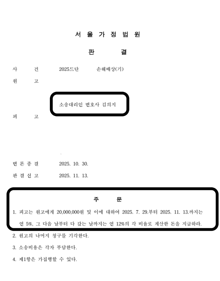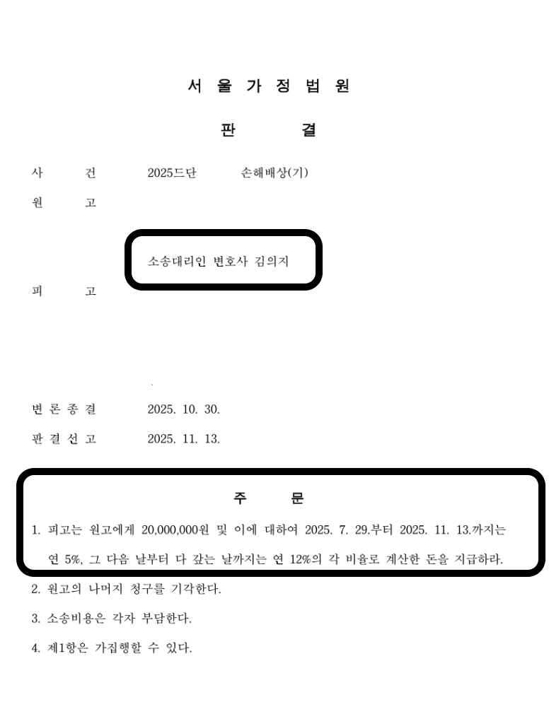 그 결과, 이례적으로 원고가 청구한 위자료 전액인 2,000만 원을 지급하라는 판결을 내렸습니다. 상간 소송에서 청구 금액 전액이 인용되는 것은 의뢰인의 피해가 그만큼 크고 명백했다는 것을 의미합니다.