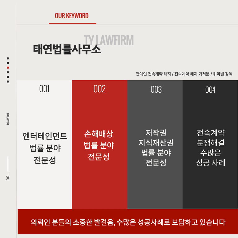 하지만 위에 제시한 조건에 모두 만족되더라도 정작 '성공한 선례'가 없으면 위험할 수 있습니다. 아직 검증이 되지 않았기 때문인데요. 따라서, 위 3가지 조건을 만족하면서도 지속적으로 전속 계약 분쟁 해결 성공 사례를 쌓고 있는 곳을 찾으실 필요가 있습니다.