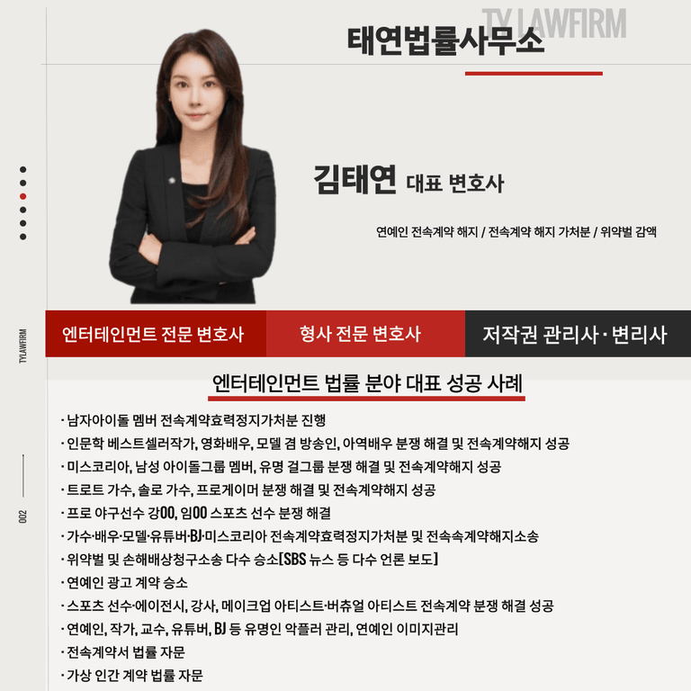 하지만 태연 법률사무소는 엔터테인먼트 전문 변호사로 유명하신 김태연 대표 변호사 님을 중심으로 대형로펌 이상으로 연예인 전속 계약 해지를 성공적으로 이끌어오고 있습니다.