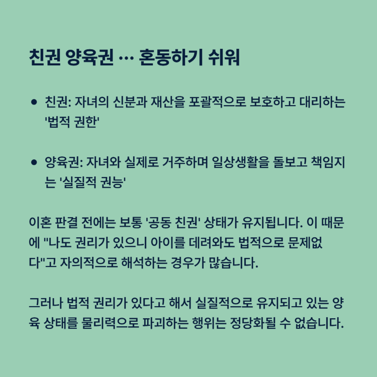 이혼 판결 전에는 보통 '공동 친권' 상태가 유지됩니다. 이 때문에 "나도 권리가 있으니 아이를 데려와도 법적으로 문제없다"고 자의적으로 해석하는 경우가 많습니다.