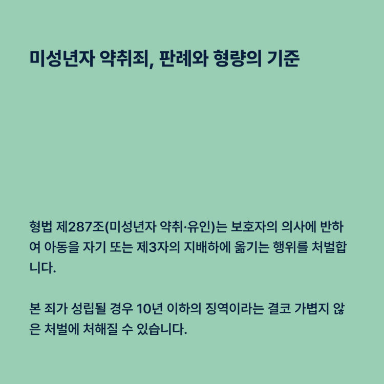 형법 제287조(미성년자 약취·유인)는 보호자의 의사에 반하여 아동을 자기 또는 제3자의 지배하에 옮기는 행위를 처벌합니다. 본 죄가 성립될 경우 10년 이하의 징역이라는 결코 가볍지 않은 처벌에 처해질 수 있습니다. 최근 대법원 판결에 따르면 부모라 하더라도 다음 요건에 해당하면 처벌을 피하기 어렵습니다.
