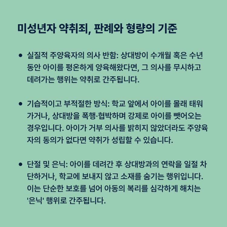 실질적 주양육자의 의사 반함: 상대방이 수개월 혹은 수년 동안 아이를 평온하게 양육해왔다면, 그 의사를 무시하고 데려가는 행위는 약취로 간주됩니다.