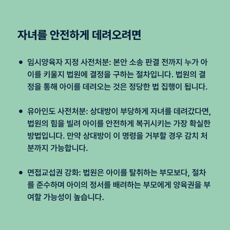임시양육자 지정 사전처분: 본안 소송 판결 전까지 누가 아이를 키울지 법원에 결정을 구하는 절차입니다. 법원의 결정을 통해 아이를 데려오는 것은 정당한 법 집행이 됩니다.