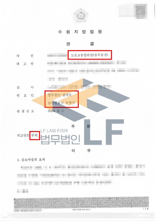 법원에서는 의뢰인의 주장을 받아들여, 제출된 증거만으로는 의뢰인이 운전을 했다고 단정하기 어렵다고 판단에 의뢰인에 무죄 판결을 내렸습니다.