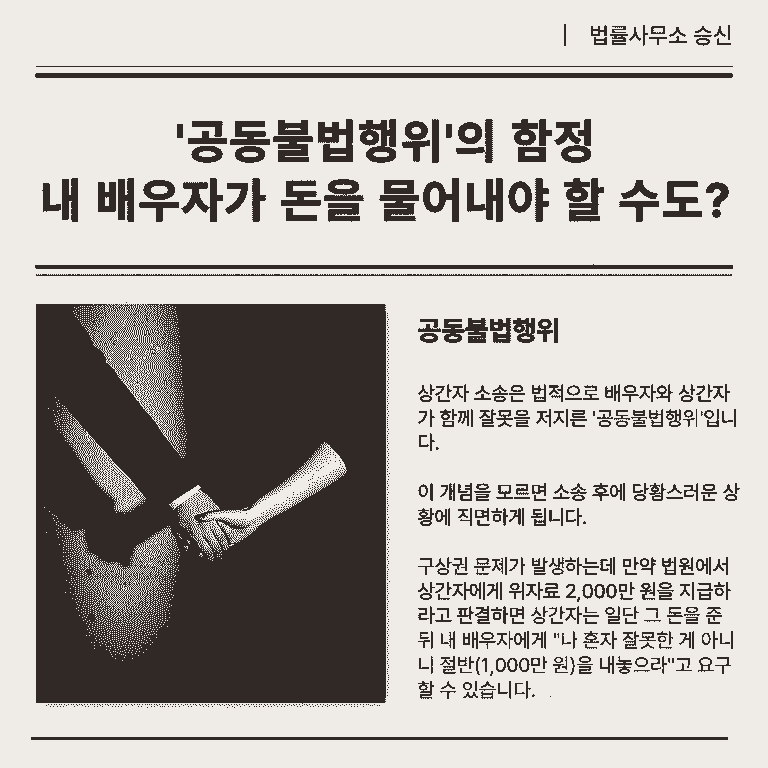 상간자 소송은 법적으로 배우자와 상간자가 함께 잘못을 저지른 '공동불법행위'입니다.