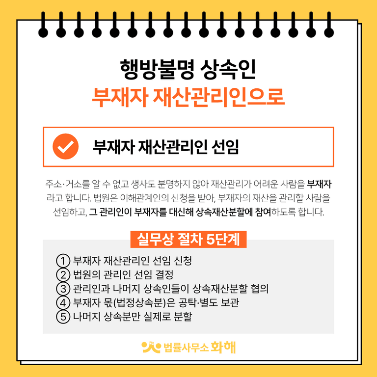 이럴 때 활용할 수 있는 제도가 바로 ‘부재자 재산관리인 선임’입니다. 부재자란 주소나 거소를 알 수 없고, 생사도 분명하지 않아 재산관리가 어려운 사람을 말합니다. 법원은 이해관계인의 신청을 받아, 연락이 닿지 않는 상속인(부재자)의 재산을 대신 관리할 사람을 재산관리인으로 선임하고, 그 관리인이 부재자를 대신해 상속재산분할협의나 상속재산분할심판 절차에 참여하도록 합니다.