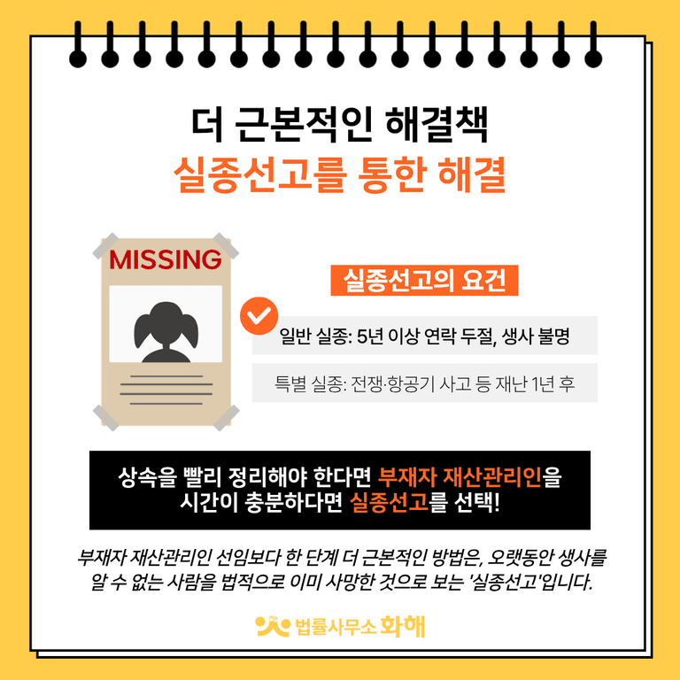 다만 실종선고를 받으려면, 원칙적으로 그 사람이 5년 이상 연락이 끊겨 있고 살아 있는지 죽었는지 알 수 없는 상태가 계속되어야 합니다. 전쟁, 비행기 사고 같은 큰 재난을 당한 경우에는 예외적으로 1년만 지나도 신청할 수 있습니다. 그래서 상속 재산을 빨리 정리해야 하는 상황이라면, 막연히 실종선고만 기다리기보다 ‘부재자 재산관리인’을 선임해 상속 절차를 먼저 진행하는 것이 현실적인 선택입니다.