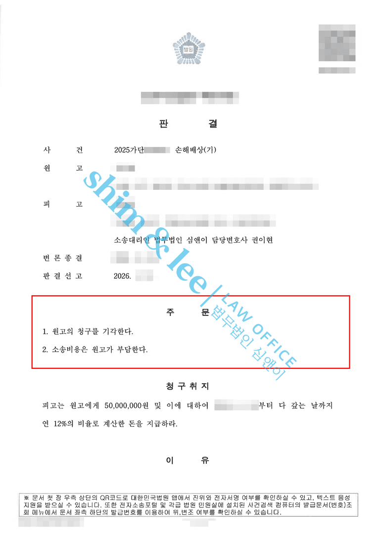 - 의뢰인은 원고가 청구한 금액 5,000만 원을 전부를 방어해내 크게 안도하셨으며, 재판부가 원고에게 소송비용을 전부를 부담하도록 판결한 점에 대해서도 크게 기뻐하셨습니다.