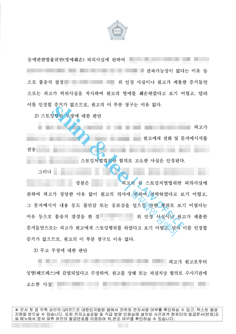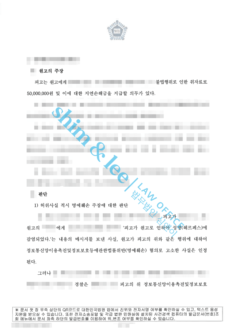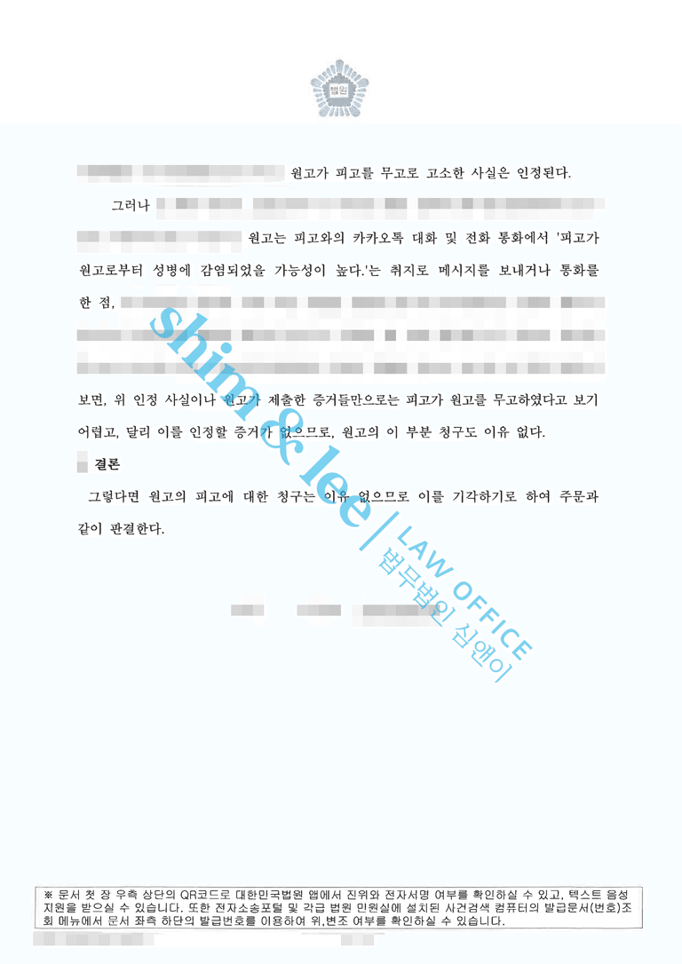 - 결과적으로 민사 재판부는 심앤이의 주장을 모두 받아들여 원고 패소 판결을 선고하였습니다. 의뢰인인 피고가 원고의 명예를 훼손하거나 스토킹한 사실이 없다는 점과 원고가 제기한 소송이 성병 감염 피해자를 상대로 한 2차 가해성 소송이라는 점이 명확히 인정된 것입니다.