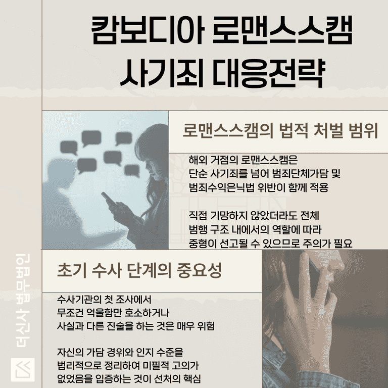 해외 로맨스스캠 연루 사건은 단순 사기를 넘어 국제적인 조직범죄로 다뤄지는 엄중한 사안입니다. 본인이 어떤 맥락에서 조사를 받는지, 어느 시점부터 범죄를 인지했는지에 따라 그 결과는 하늘과 땅 차이입니다.